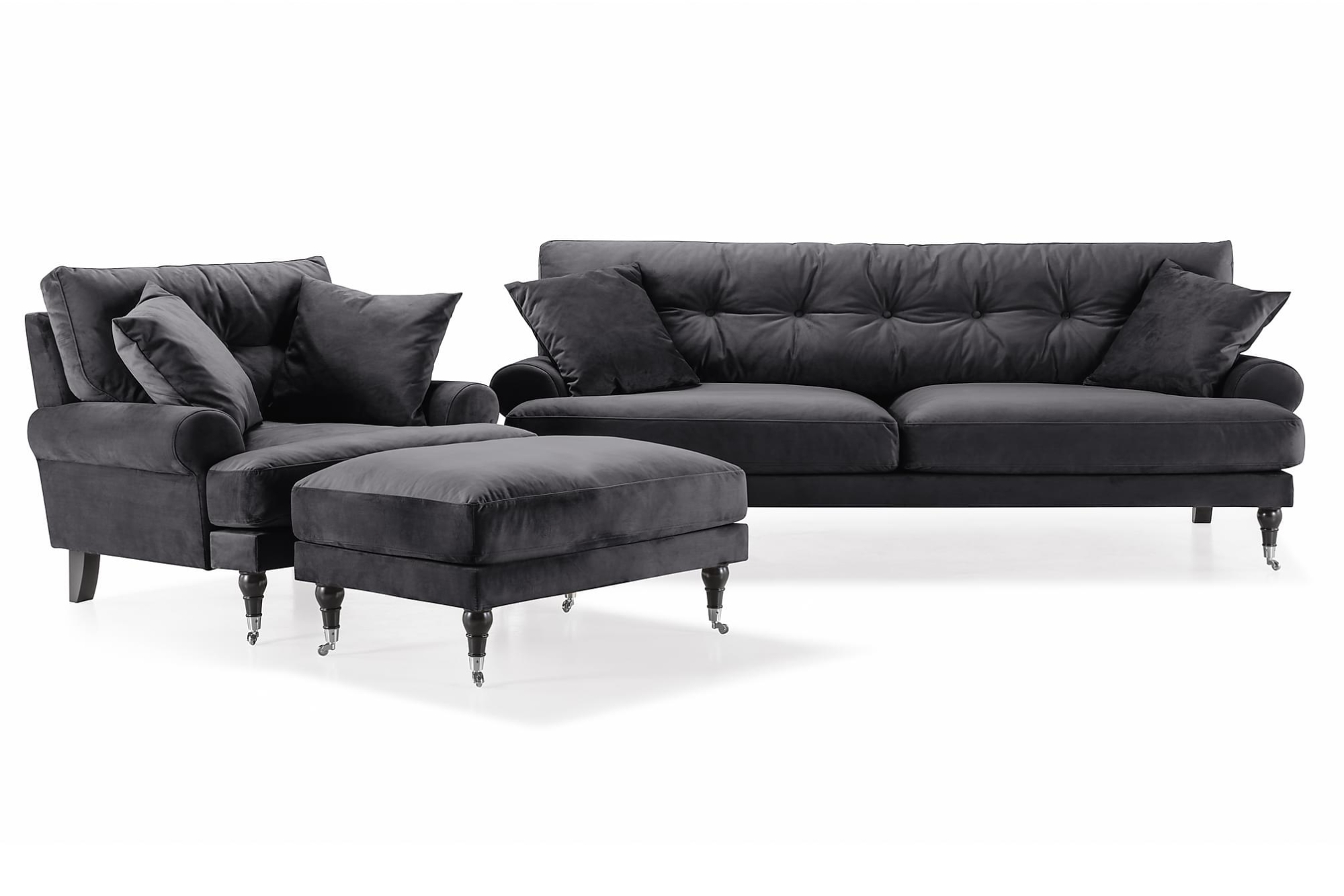 Andrew Sofagruppe (3 Pers. Sofa, Lænestol Og Puf), Mørkegrå Velour