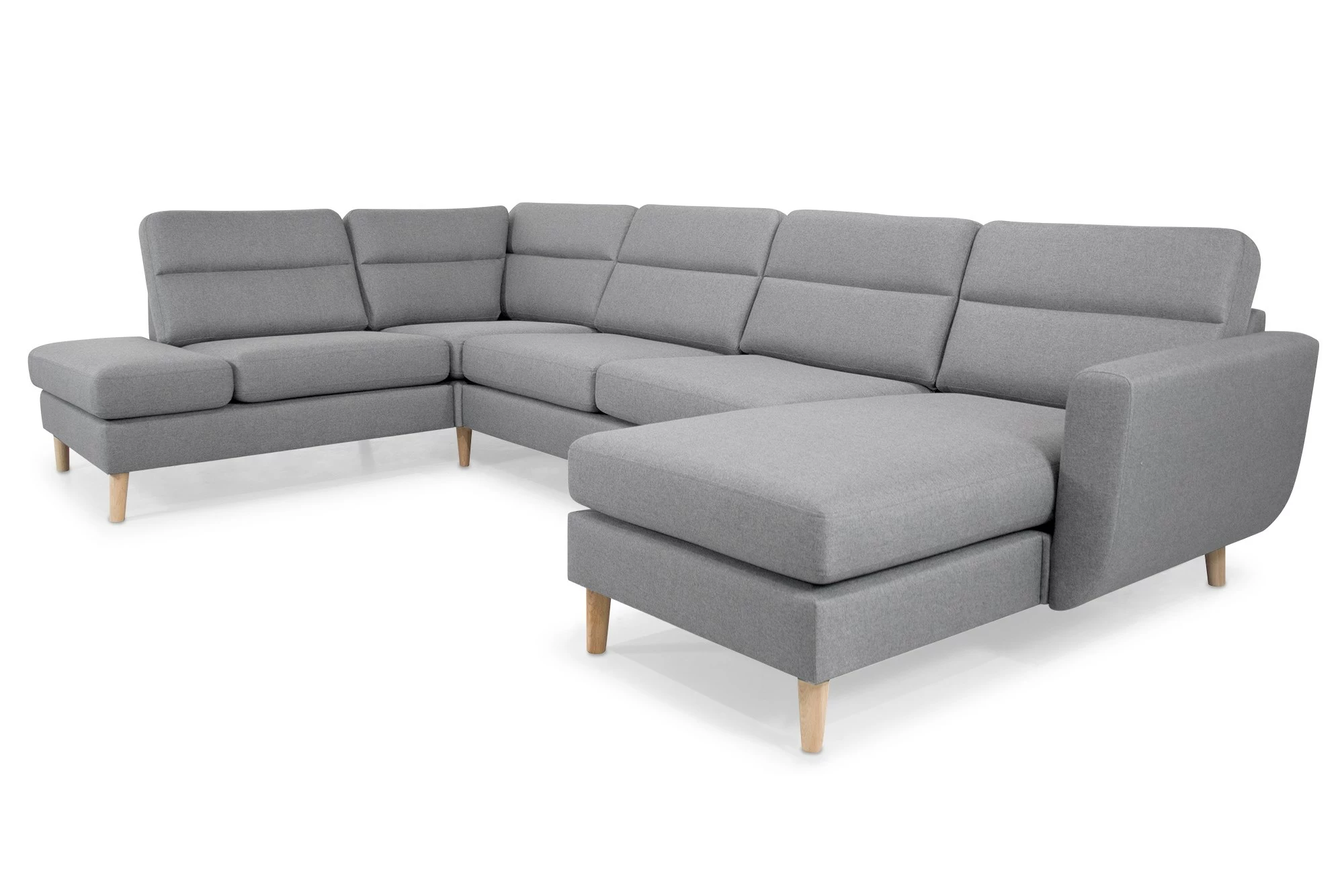 Vores Arizona u-formet hjørnesofa med open-end og chaiselong er monteret med lysegråt slidstrækt stof samt massive træben. Sofaen har derudover sædehynder med koldskumsindlæg. Den måler 86 cm i højden, 87 cm i dybden, 332 cm i længden og open-end delen må