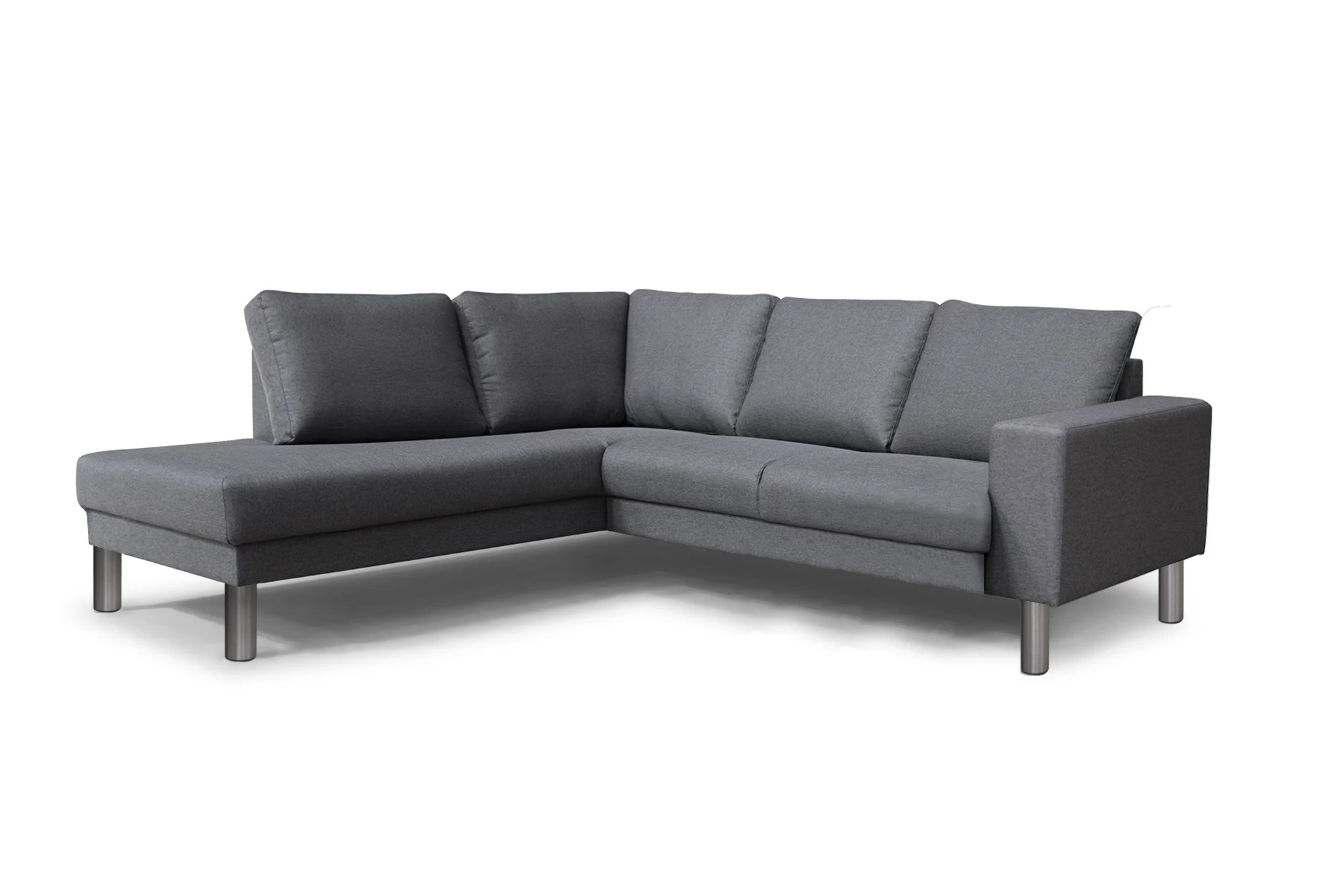 Vores Barcelona 5 personers hjørnesofa med open-end er monteret med et slidstærkt betræk i antracitgråt stof samt ben i metal. Sofaen er venstrevendt. Husk! Den side chaiselongen er i, når du står foran sofaen er afgørende for, hvordan sofaen vender. Ønsk