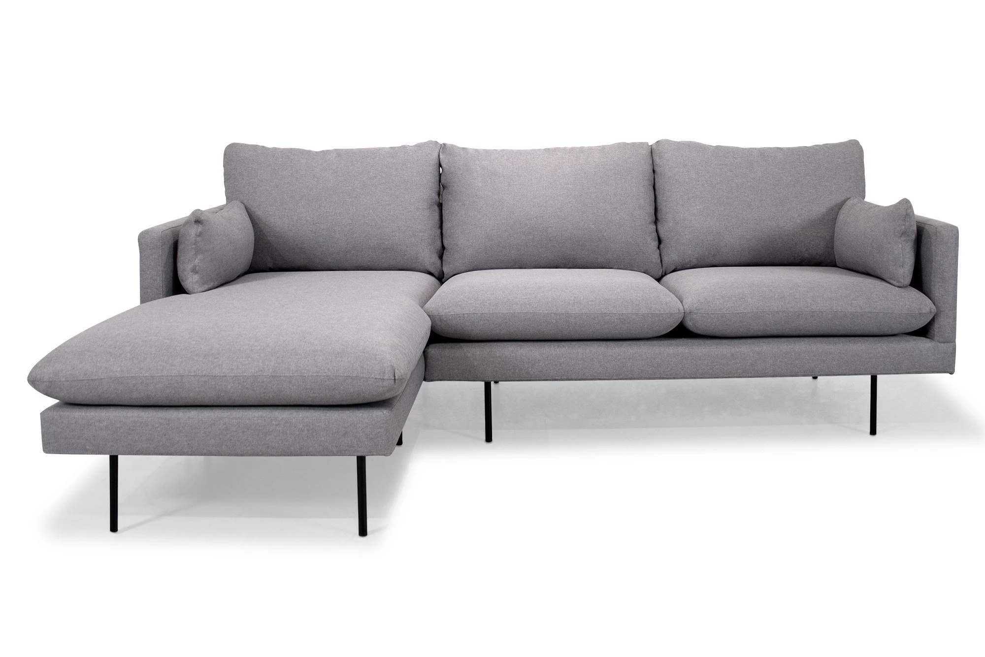 Cambridge venstrevendt sofa med et klassisk udseende og med lækre puffede hynder. Alt sammen i lysegråt stof, og sofaen er monteret med sortlakerede ben i metal. Denne moderne Cambridge sofa med behagelig siddekomfort vil passe ind i stort set alle hjem,