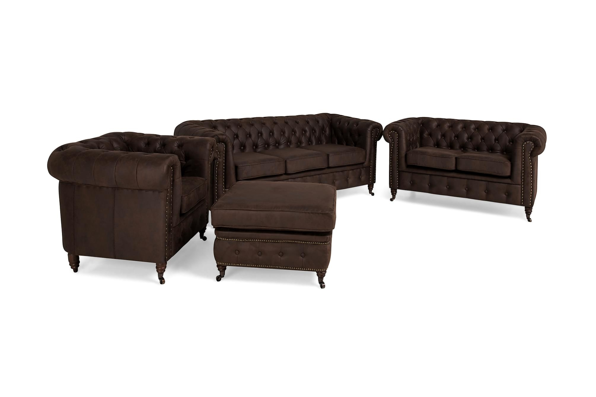 Chesterfield Deluxe Sofagruppe (3+ 2 Pers. Sofa, Lænestole Og Puf), Mørkebrun