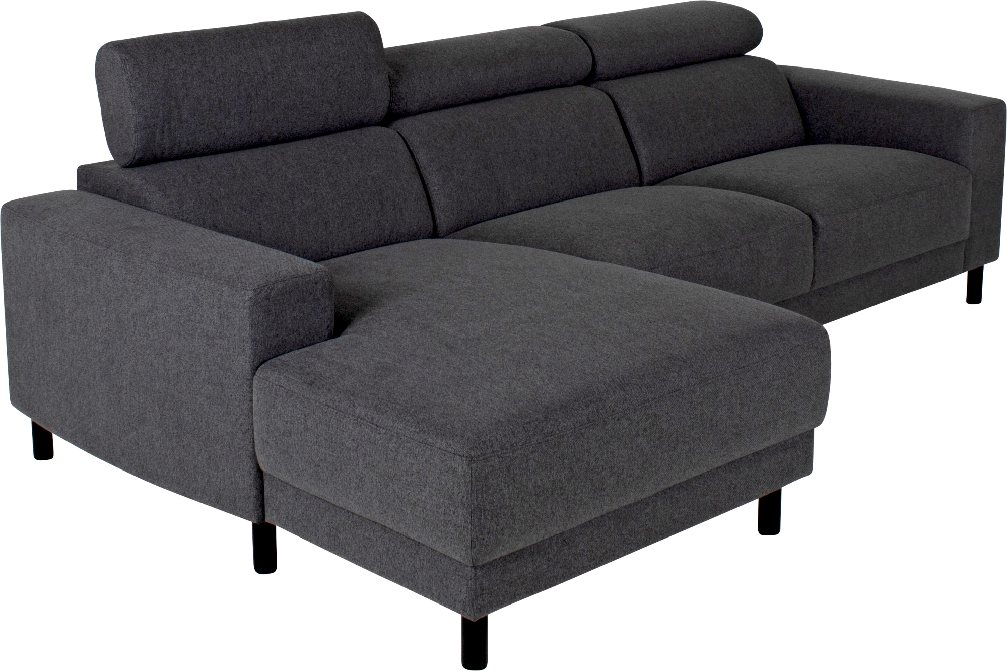 Flot 3 personers sofa med chaiselong i antracitgråt stof. Sofaen er med sorte runde træben og er monteret med justerbar nakkestøtte, der er med til at give sofaen kant. Sofaen er venstrevendt. Husk! Den side chaiselongen er i, når du står foran sofaen er