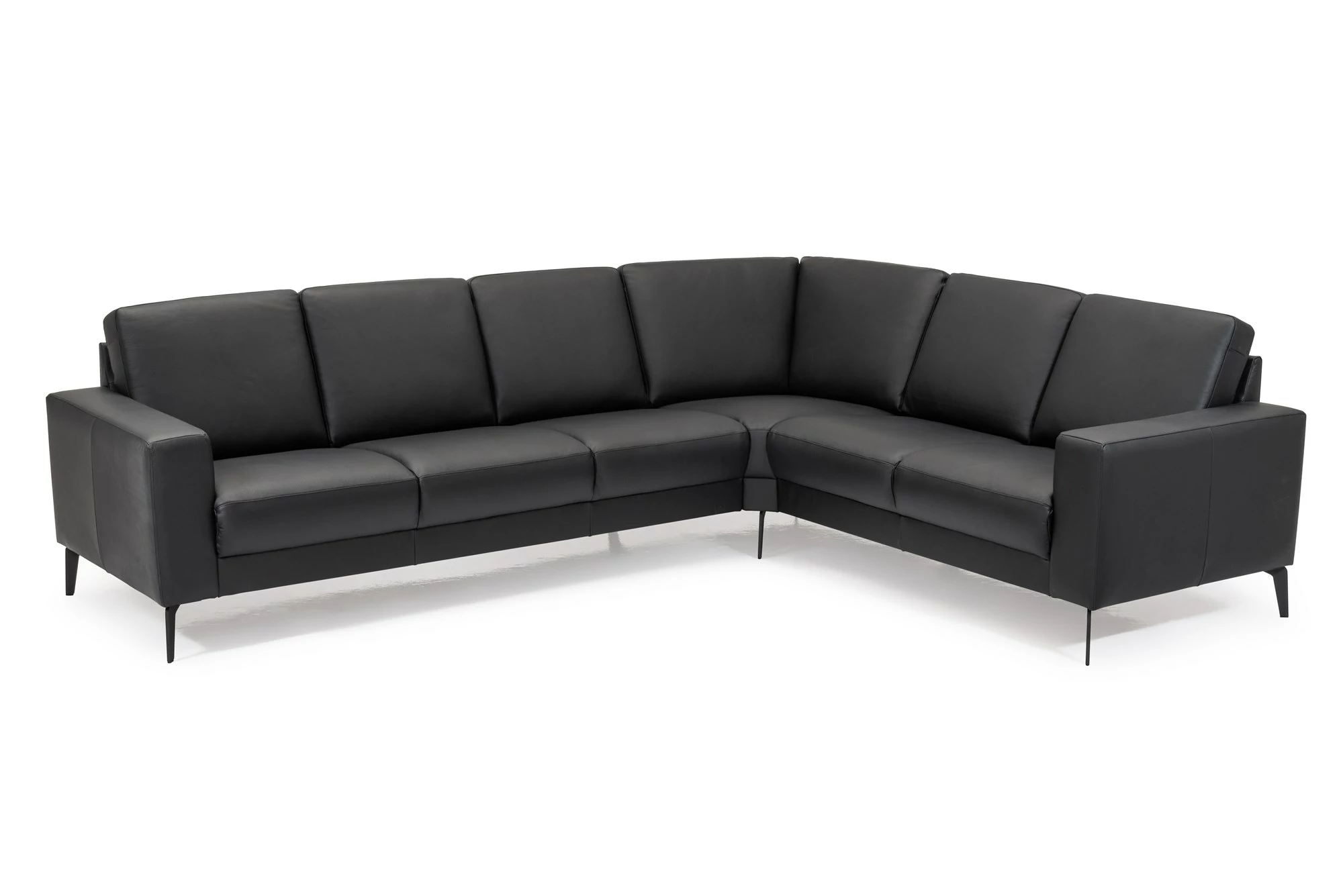 Klassisk venstrevendt hjørnesofa til seks personer i sort læder på alle slidflader. Sofaen er med pocket indlæg i sædet og polyetherskum i ryggen. Komforten er derfor helt i top. Sofaen leveres med sorte stålben. Hjørnesofaen måler 88 cm i højden, 230 cm