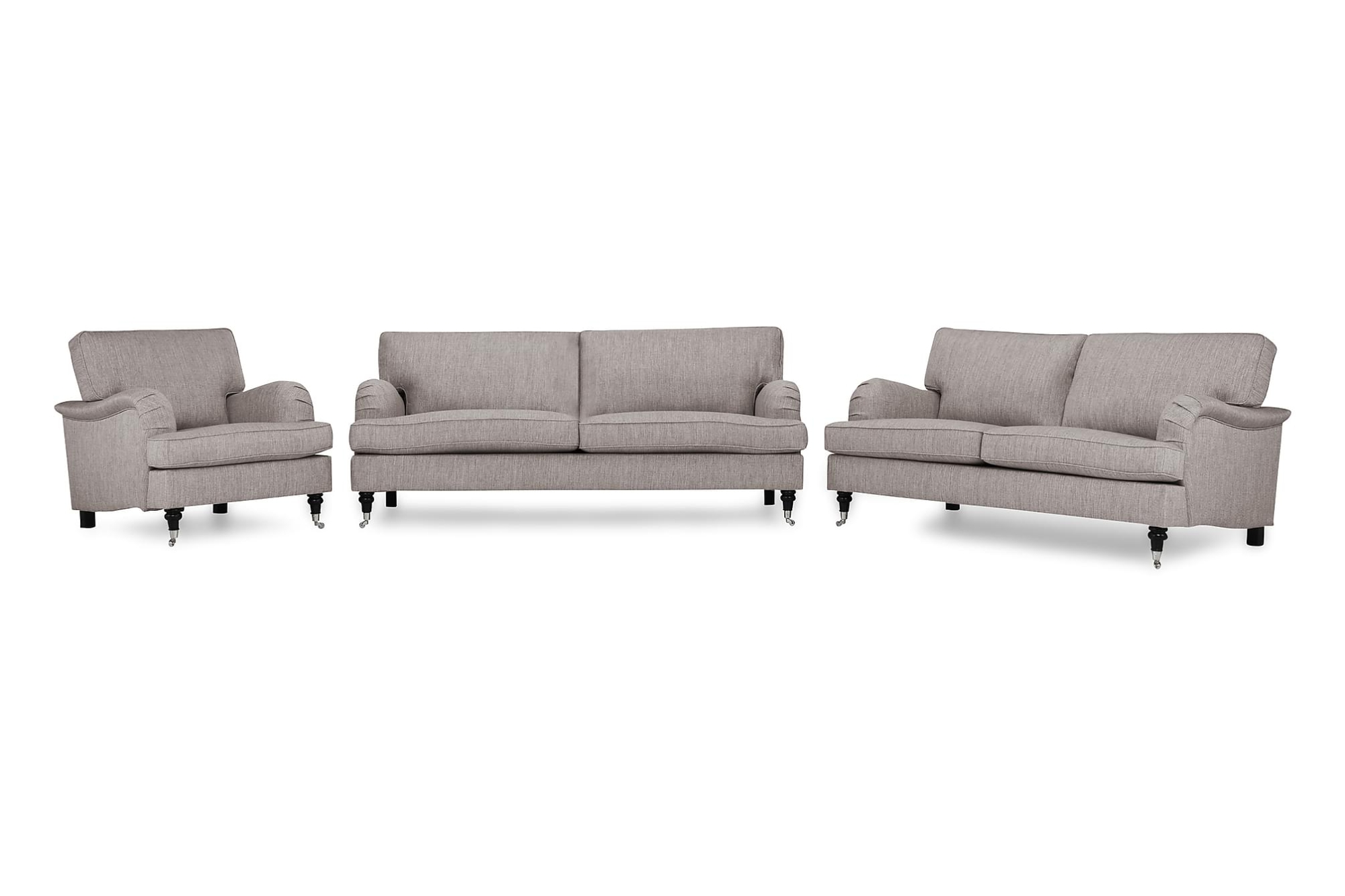 Sofagruppe som består af en 3,5-personers sofa, en 3-personers sofa og en lænestol i gråbrunt stof. Køb en sofagruppe og få et komplet møblement til stuen til en ekstremt god pris! 3-personers sofaen har en højde på 83 cm, en dybde på 97 cm og en længde p