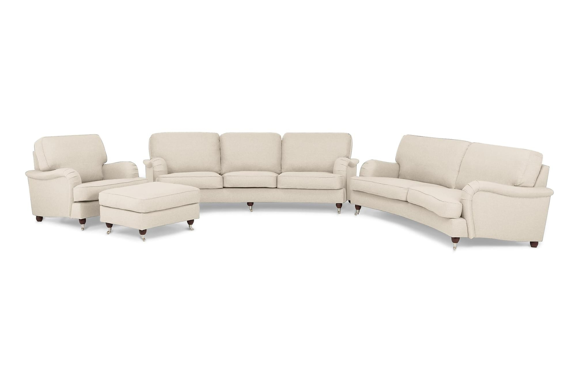 En sofagruppe bestående af en buet 4-personers sofa, en 3-personers, en lænestol med en fodskammel i en beige farve. Køb denne sofagruppe og få en stue som stort set er færdig møbleret til et fantastisk pris! Howard er en elegant sofa med flotte detaljer.