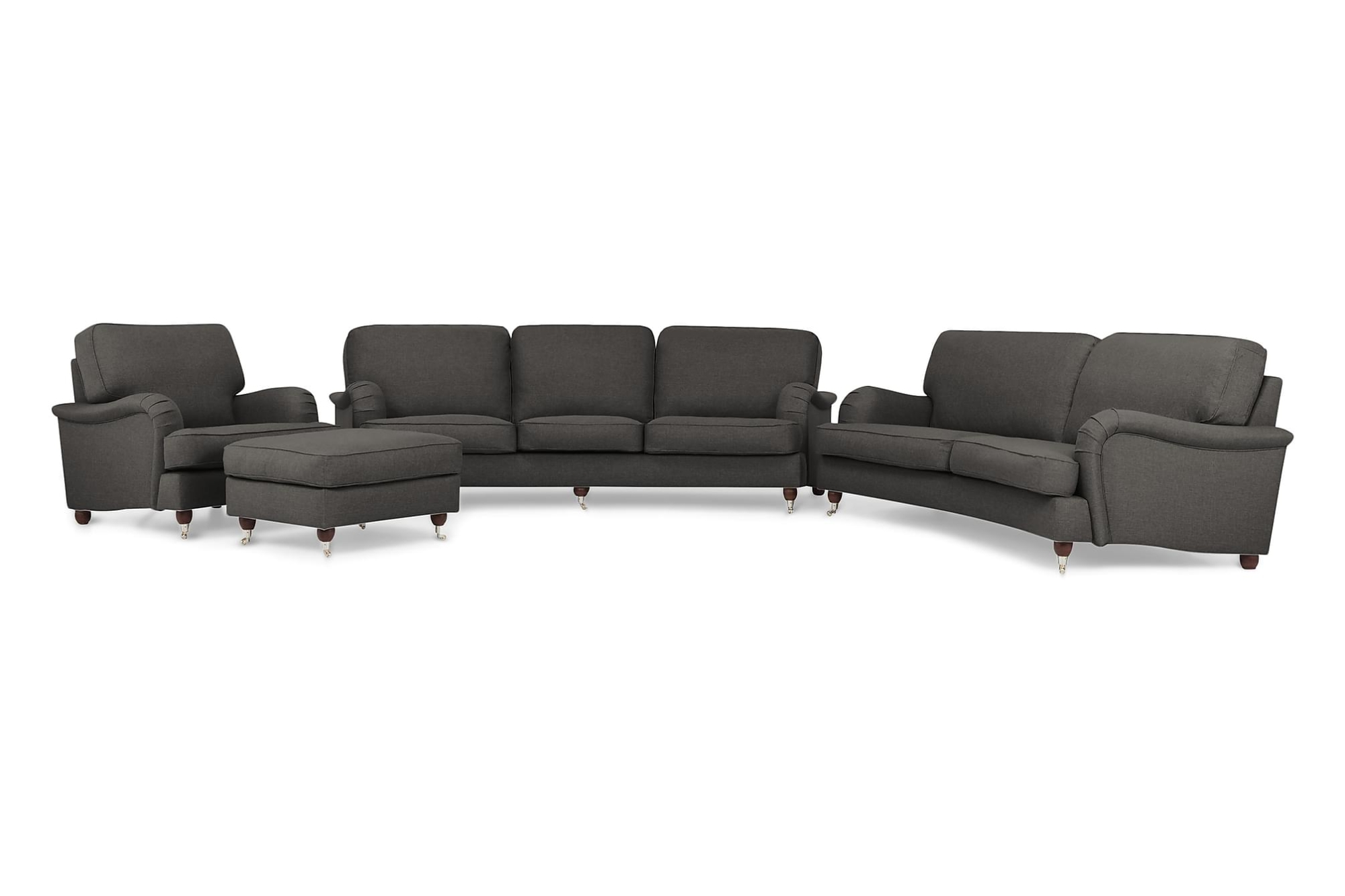 Et sofasæt bestående af en buet 4-personers sofa, en buet 3-personers sofa, en lænestol og en skammel i mørkegrå. En stort set møbleret stue til en fantastisk pris! Howard er en elegant sofa med flotte detaljer. De forreste ben er smukt bearbejdet og mont