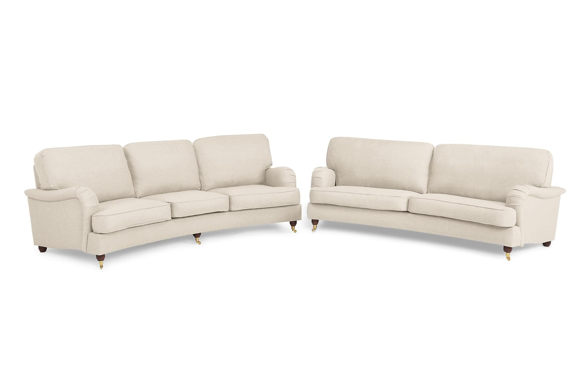 Et sofasæt bestående af en buet 4-personers sofa og en buet 3-personers sofa. En stort set møbleret stue til en fantastisk pris! Howard er en elegant sofa med flotte detaljer. De forreste ben er smukt bearbejdet og monteret med messing hjul for nem bevæge