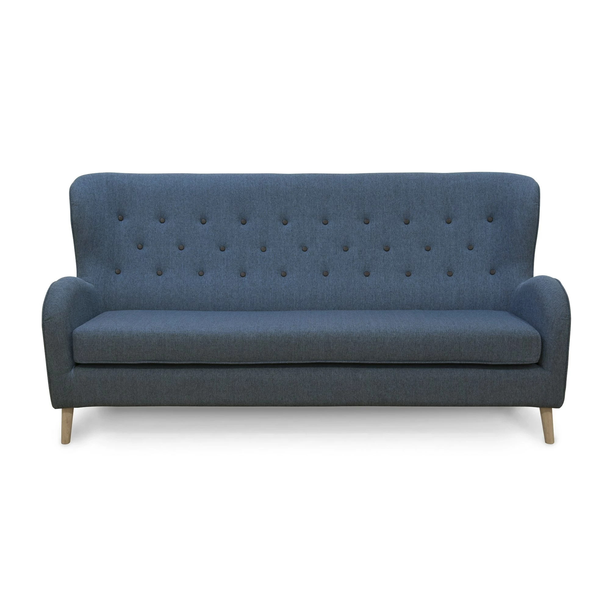 Retro tre personers sofa i petrolfarvet stof med sorte læderknapper og massive træben. Sofaen måler 100 cm i højden, 88 cm i dybden og er 200 cm i lang. Sofaen findes også i en to personers udgave. Den kan du se her. Du finder resten af King-serien her. H
