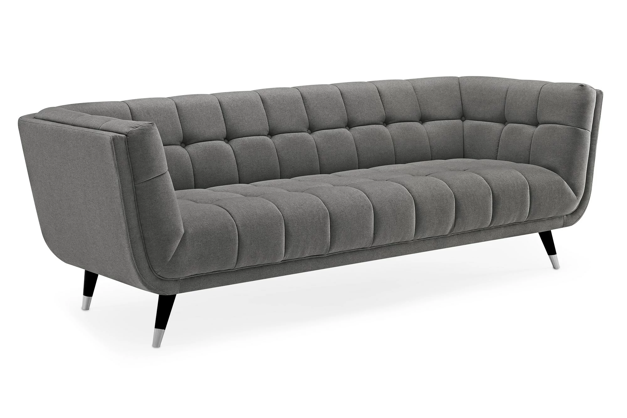 Tokyo 3 persones sofa er en moderne og stilren sofa. Den fås med sortlakerede, massive ben i heveatræ og med sølvhætte for at fuldføre det unikke design. Sofaen er monteret med gråmeleret betræk med knapper og kuvertsyninger på alle flader. Den har en høj